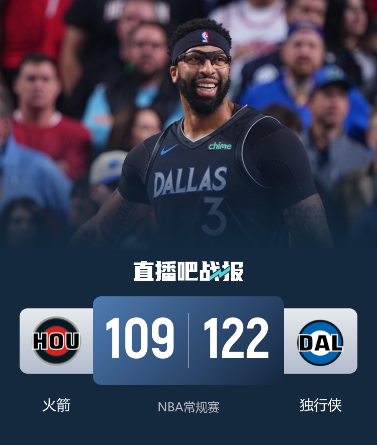 比赛开始,独行侠利用主场优势率先发力,浓眉高效输出带队很快取得两位数领先,杜兰特连得7分止住颓势,谢泼德劈扣率队反超,次节双方陷入缠斗,比分交替领先,浓眉和布兰登·威廉姆斯联手拿分,杜兰特延续火力给出回应,半场战罢双方打出57平。易边再战,火箭突然哑火,独行侠大举进攻,轰出20-4的进攻狂潮确立优势,末节独行侠将分差拉开到20分以上,此后火箭苦苦追赶无奈分差过大。最终,火箭109-122不敌独行侠,客场落败。