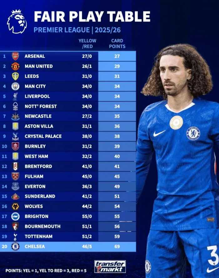 01-09 德转统计英超红黄牌积分榜,切尔西领跑